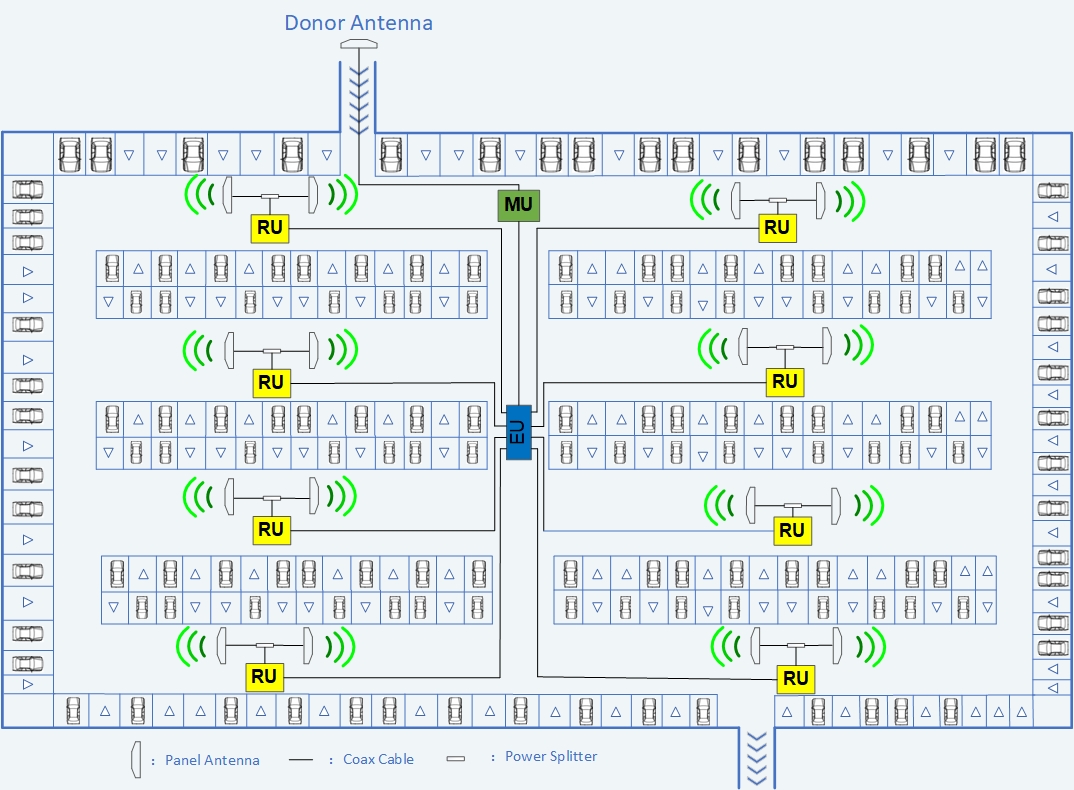 The micro distributed system consists of three-tier devices: a main unit, expansion units, and coverage units. The main unit receives wireless signals from outdoor macro base stations, while the expansion units connect to multiple coverage units for signal extension and distributed coverage. The One-to-Eight Expansion Unit supports efficient and extended signal distribution, making it ideal for scenarios such as underground parking lots, supermarkets, entertainment venues, and ground-floor shops