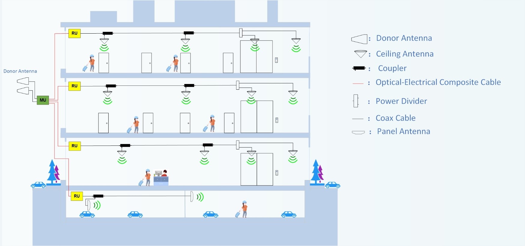 The Medium-Power optical distribution system mainly consists of MU and a RU. The MU can either receive wireless signals from outdoor base stations or directly couple the RF signals of base stations via a feeder. After the signals undergo digital processing, they are transmitted to the Remote Unit through optical fibers. Additionally, the MU can be directly connected to multiple RUs, which is used to quickly address coverage issues in enclosed blind spots or weak coverage areas with low traffic volume. It is a system-level solution designed for scenarios such as underground parking garages, shopping malls, hotels, and similar locations.